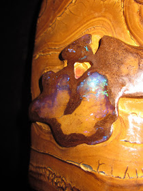 a very unique sculpture with the back exposing the cream potch Opal in the center, and with sparkling Opal Matrix and detailed patterns over the outer surface.